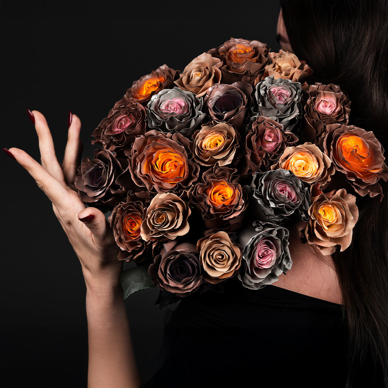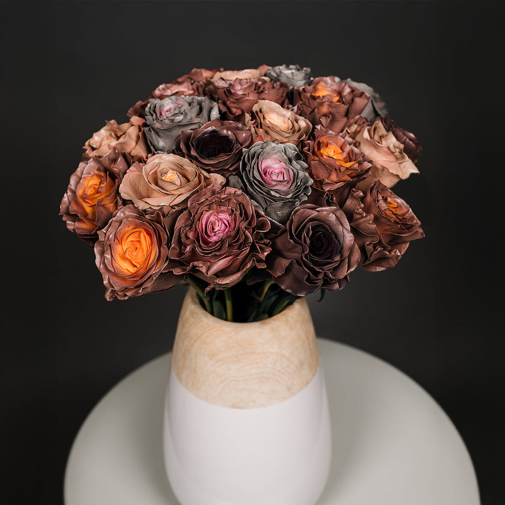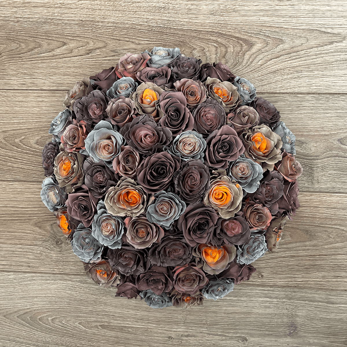 Join us on a journey through gray, brown, and orange roses. Delve into the magical symbolism of this floral creation. Here, tradition meets the mysterious in a hauntingly beautiful embrace.